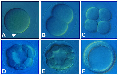 L. variegatus zygotes, viewed from the side. A. 1-cell zygote. The fertilization envelope is visible as a large "halo" around the embryo. The arrow points to the site of sperm penetration. B. 2-cell. C. 8-cell. D. 16-cell. E. 32-cell. F. Hatched blastula (F is courtesy Dr. Chuck Ettensohn, Carnegie-Mellon Univ.).