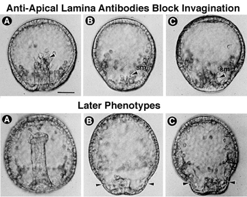 Primary invagination can be disrupted by treating embryos with monoclonal antibodies that recognize a family of proteins called fibropellins that reside in the apical lamina. Panels B and C in the top row are embryos treated with two different monoclonals; the control invaginates normally (A). As control embryos invaginate (A, bottom row), the antibody-treated embryos can only muster a small indentation (B,C, bottom row). Photos are courtesy of Dr. Robert Burke, Univ. of Victoria.
