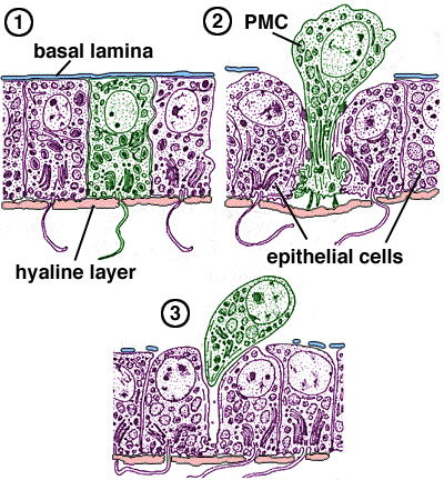 Primary mesenchyme cells (PMCs) must undergo several changes in their adhesive properties in order to detach from the epithelium of the vegetal plate and ingress into the interior: (1) they must lose affinity for neighboring epithelial cells that remain in the vegetal plate; (2) they must lose affinity for the hyaline layer on the exterior of the embryo; and (3) they presumabl;y must gain affinity for the basal lamina,. since PMCs later migrate within the blastocoel. Hideki Katow anf Michael Solursh used transmission electron microscopy to show that PMCs undergo a dramatic reorganization of their cytoskeleton and their contacts with these three regions during ingression. A colorized adapatation of their original work is shown here: