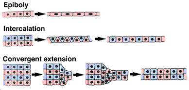 The "morphogenetic repertoire" of cells in the gastrula includes the three additional movements shown on the right. Of these, the specialized form of intercalation known as convergent extension is the most important morphogenetic movement involved in the construction of the primary body axis in amphibians. As we will see, convergent extension is a key event both during gastrulation, when convergent extension of the marginal zone occurs to create the incipient anterior-posterior axis, and during neurulation, when convergent extension of the central region of the neural plate, or notoplate, occurs as the neuraxis elongates and the neural tube closes.