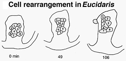 Although we now know that convergent extension occurs, it has been difficult to study it in vivo. Hardin (1989) used the species Eucidaris tribuloides (a pencil urchin from the Caribbean) to study this process. The embryos of this species are incredibly transparent, and their secondary mesenchyme never attach to the animal pole. Since their SMCs can't be pulling upward to any appreciable extent, this provides a "natural experiment" for studying active convergent extension. In this case, convergent extension could be visualized directly.