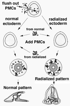 If the ectodermal environment provides local cues for PMC patterning, then one hypothesis regarding how nickel works is that it affects the ectoderm. Then if the ectoderm failed to provide the appropriate signals to the PMCs, they would adopt a radialized pattern. If the predominant problem were with the ectoderm, then transplanting PMCs from a radialized embryo into normal ectoderm would be expected to yield a normally patterned skeleton. We can do this sort of experiment by flushing PMCs out of the blastocoel to create an ectodermal "shell" into which we transplant fluorescently labeled PMCs. Go to the next page to see what actually happens... |
