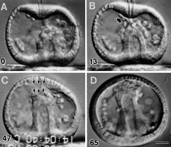 We can allow SMCs to touch the animal pole region earlier than they would normally by denting down the animal pole ectoderm. When this is done, in some cases the SMCs rapidly cease their exploratory behavior an make stable attachments to the animal pole, resulting in an abnormally short archenteron (C). Go to the next page to see the converse experiment...