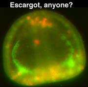 A L. variegatus late gastrula, immunostained to show the bilateral pattern of primary (skeletogenic) mesenchyme (green) and a subset of secondary mesenchyme that express the SNAIL protein (orange). Both primary and secondary mesenchyme cells localize to specific regions of the embryo. The next few pages examine the cellular interactions that specify their pattern.